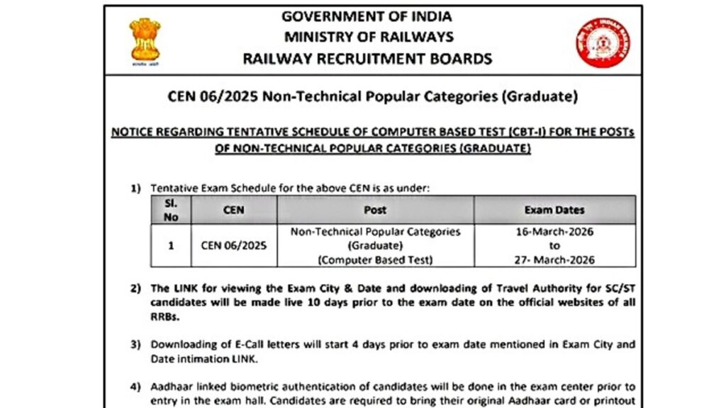 RRB NTPC Exam Date 2026: आरआरबी ने एनटीपीसी ग्रेजुएट लेवल सीबीटी-1 के लिए जारी की एग्जाम डेट, परीक्षा इस दिन से होगी शुरू